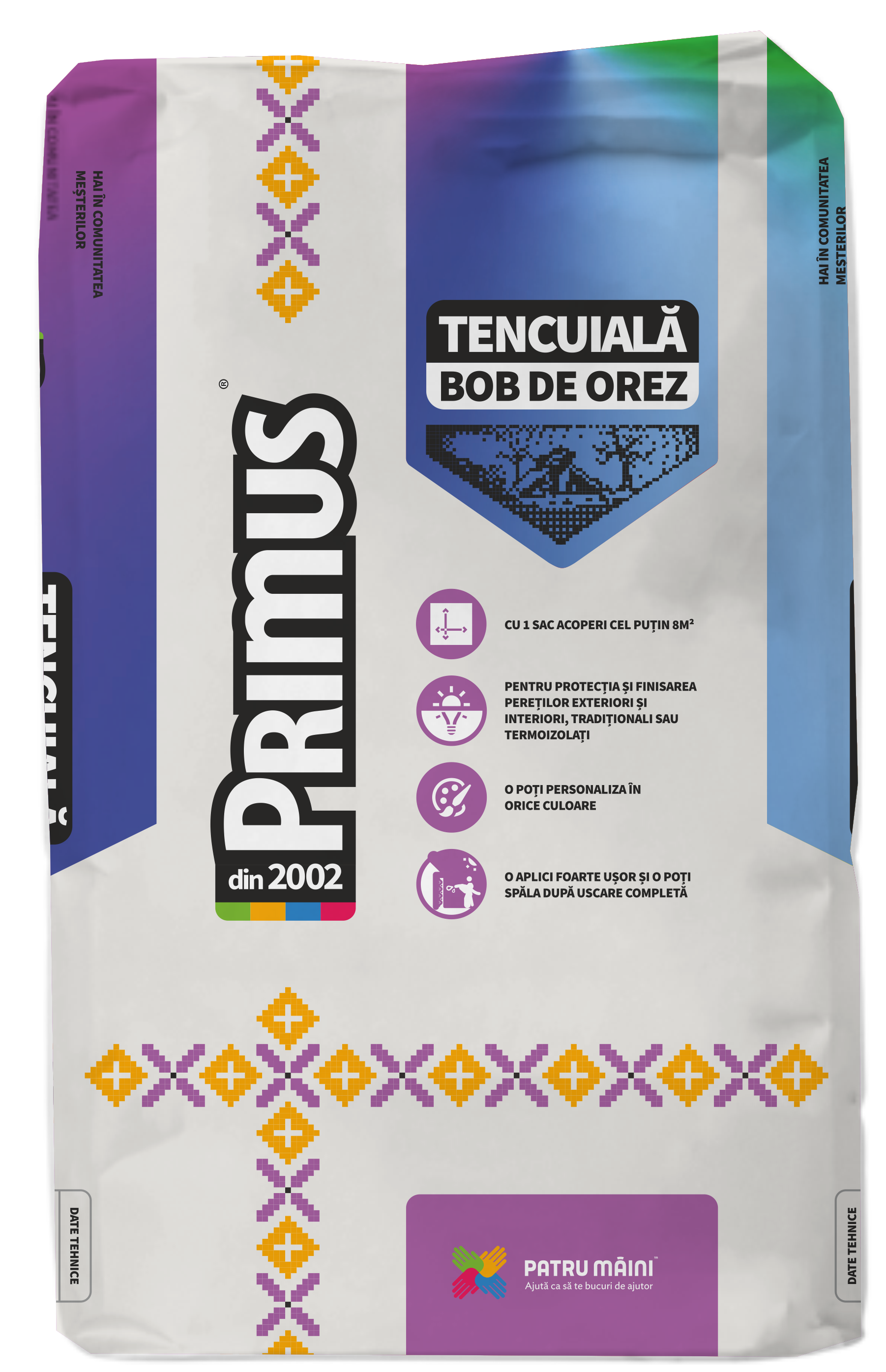 Primus Tencuiala decorativă la sac – Bob de orez, cu granulaţie de până la 2mm este recomandată pentru finisarea şi protejarea suprafeţelor exterioare şi interioare din beton (cu vechime de 6 luni de la turnare), tencuieli minerale pe bază de ciment sau ciment-var, a suprafeţelor de gips-carton, a gleturilor, a sistemelor termoizolante etc.