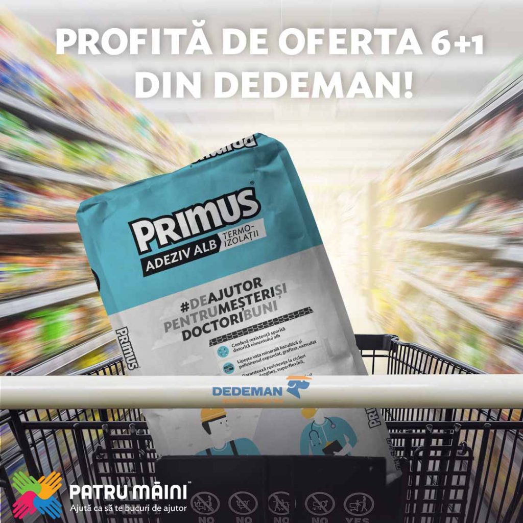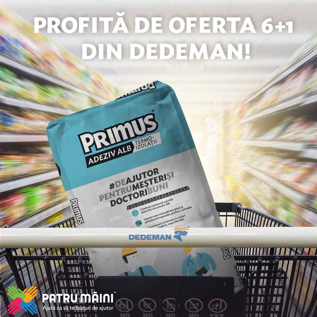 In perioada 12 Septembrie – 06  Noiembrie 2019 in reteaua Dedeman te bucuri de promotia 6 + 1 GRATIS la produsul Primus Adeziv Alb Termoizolatii (Adeterm Alb) 25kg.