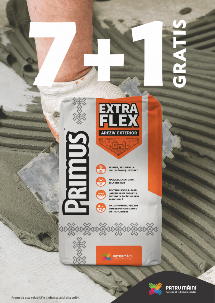 În perioada 1 Septembrie – 30 Septembrie 2022 în rețeaua Dedeman te bucuri de promoția 7 + 1 GRATIS la produsul Primus Adeziv Exterior 25kg. Primus Adeziv Exterior este un adeziv flexibil de exterior, pentru toate tipurile de plăci ceramice, piatră naturală şi plăci termoizolante din polistiren. Primus Extraflex ⬇️  aplicat în pat gros  poți placa pe surporturi cu […]